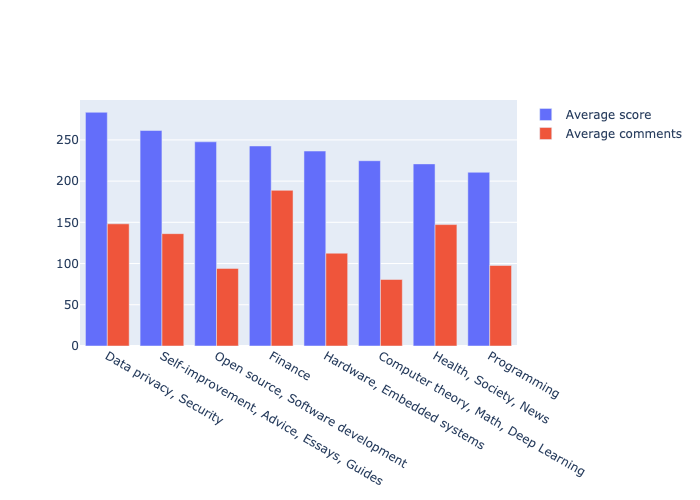 Disclaimer: The following charts contain bias and might not be representative of the real-world. Indeed, the data has only stories with a score greater than 100 and articles that are unavailable (image, some gated content, etc.) were not included.