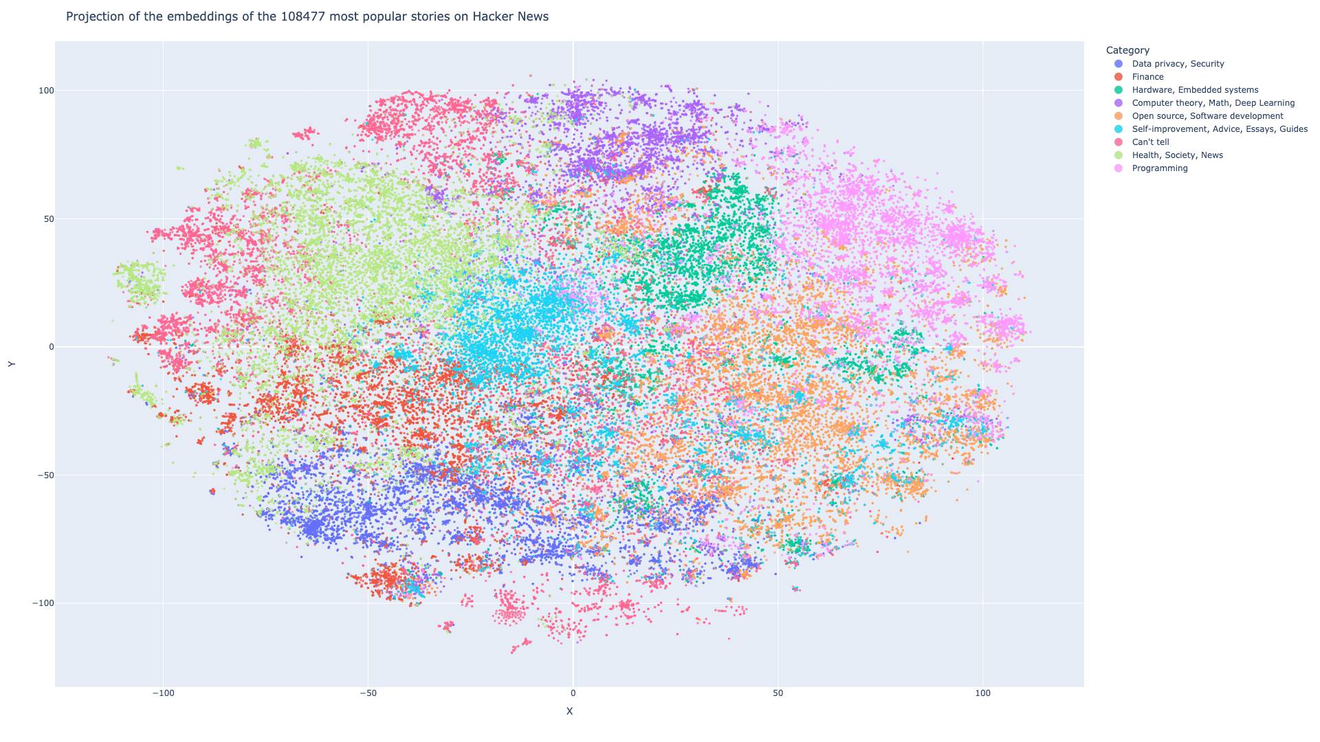 Each post can be mapped to a vector (x, y). For example,« Stripe is Now a $20B Company » equals to (-10.5, -1.5).